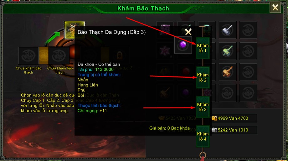 Cứ như vậy chúng ta đã khảm 3 bảo thạch lên 3 lỗ trên trang bị.